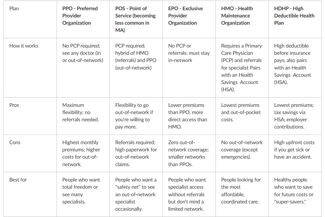 Plan types: HMO vs PPO vs EPO vs POS vs HDHP
